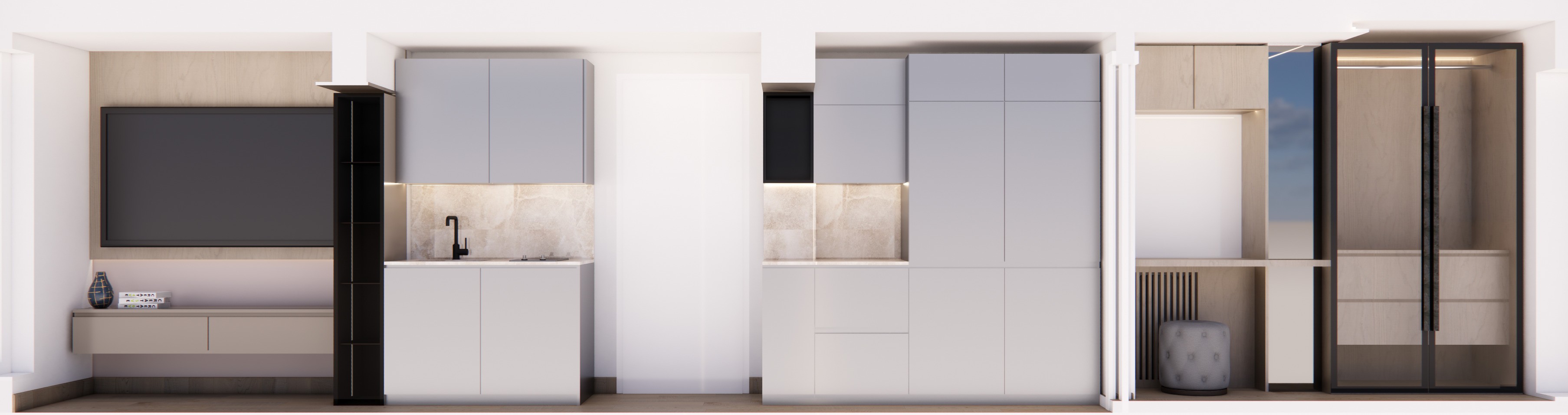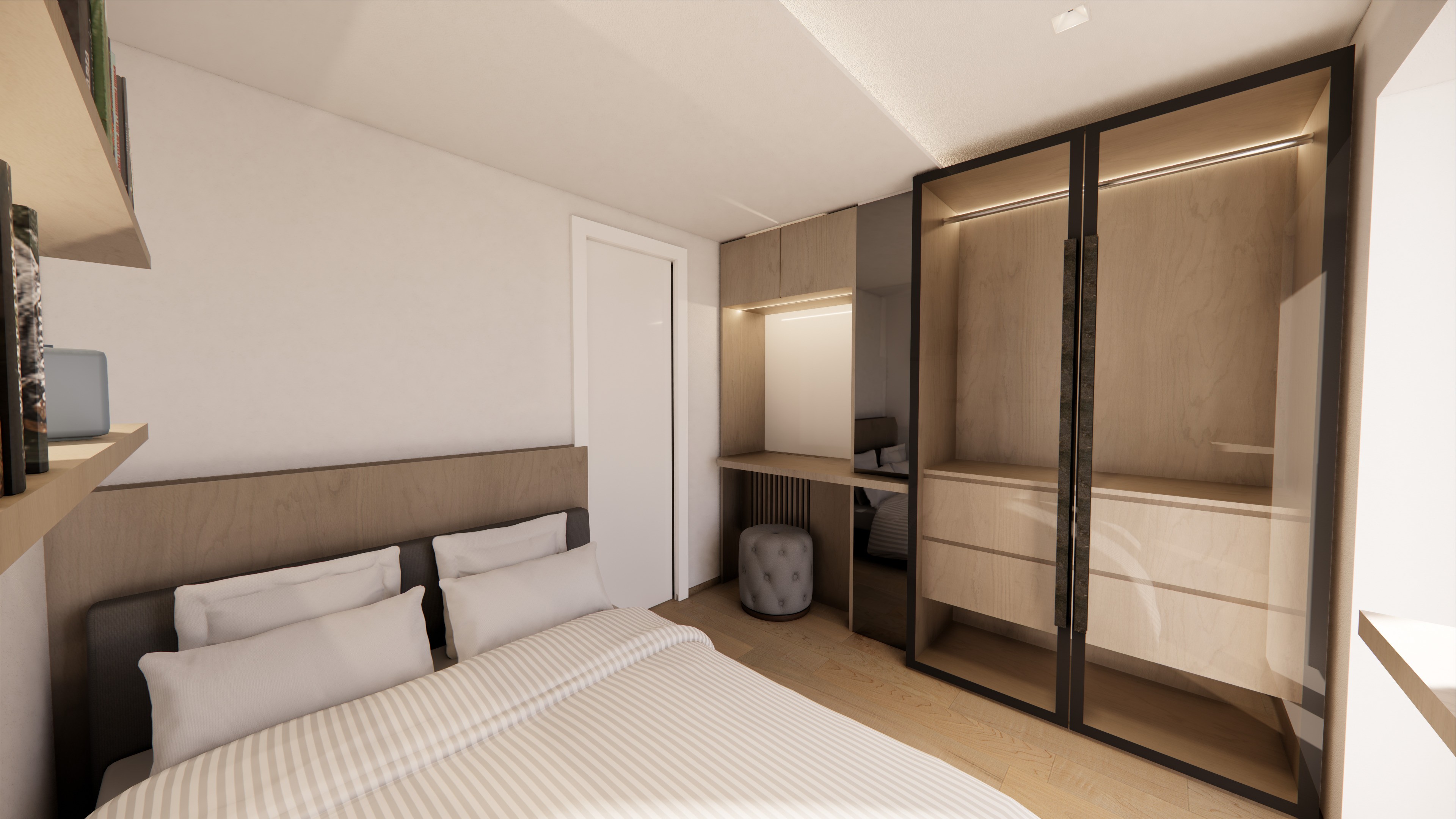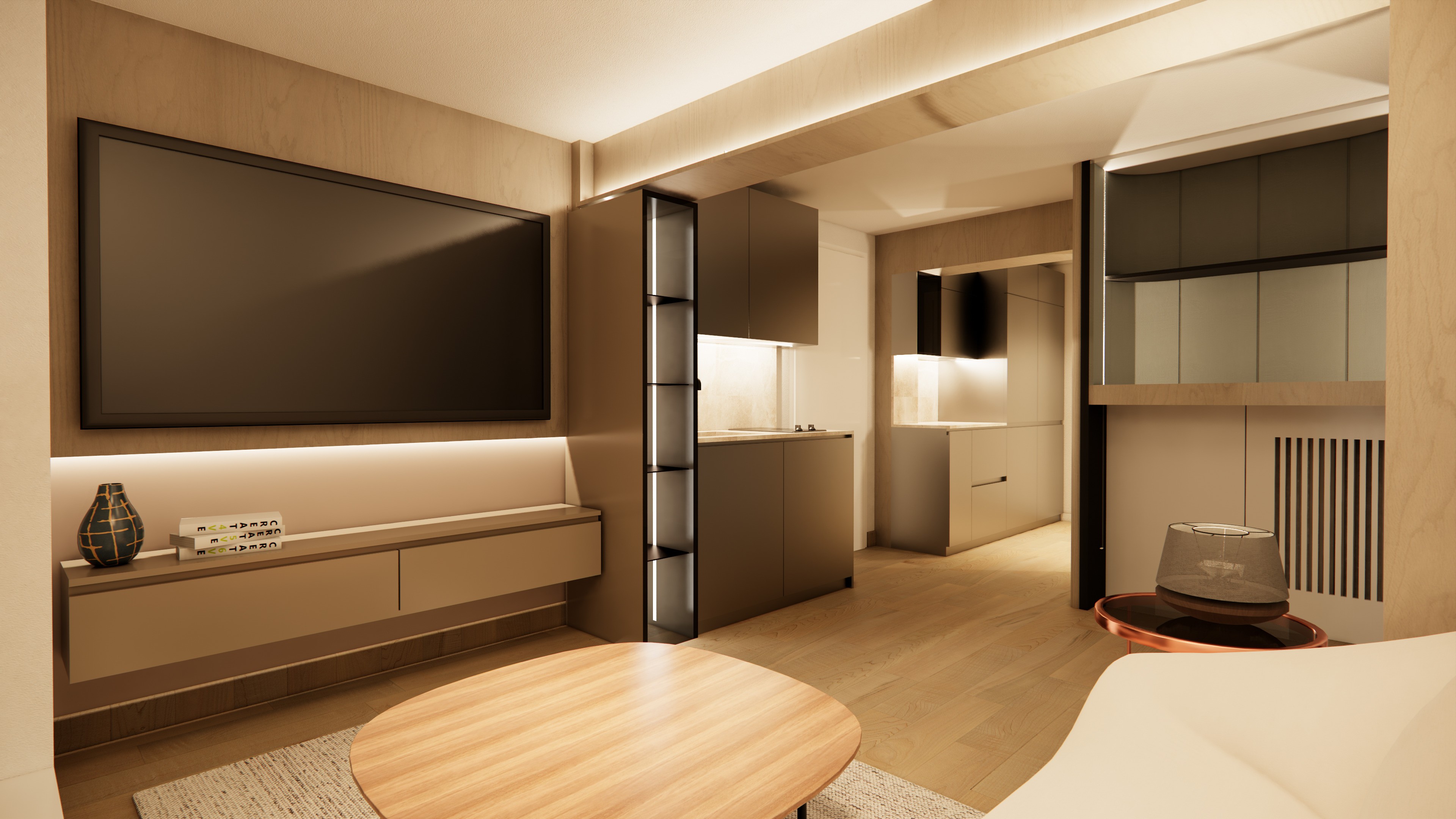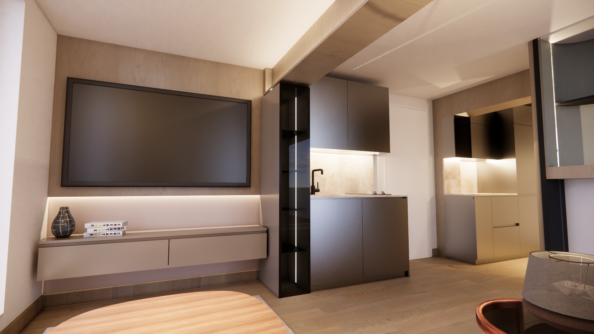 Un sistema di rivestimenti in legno costruisce l’identità dell’ambiente e ne organizza le funzioni, creando un insieme caldo, ordinato e altamente funzionale.