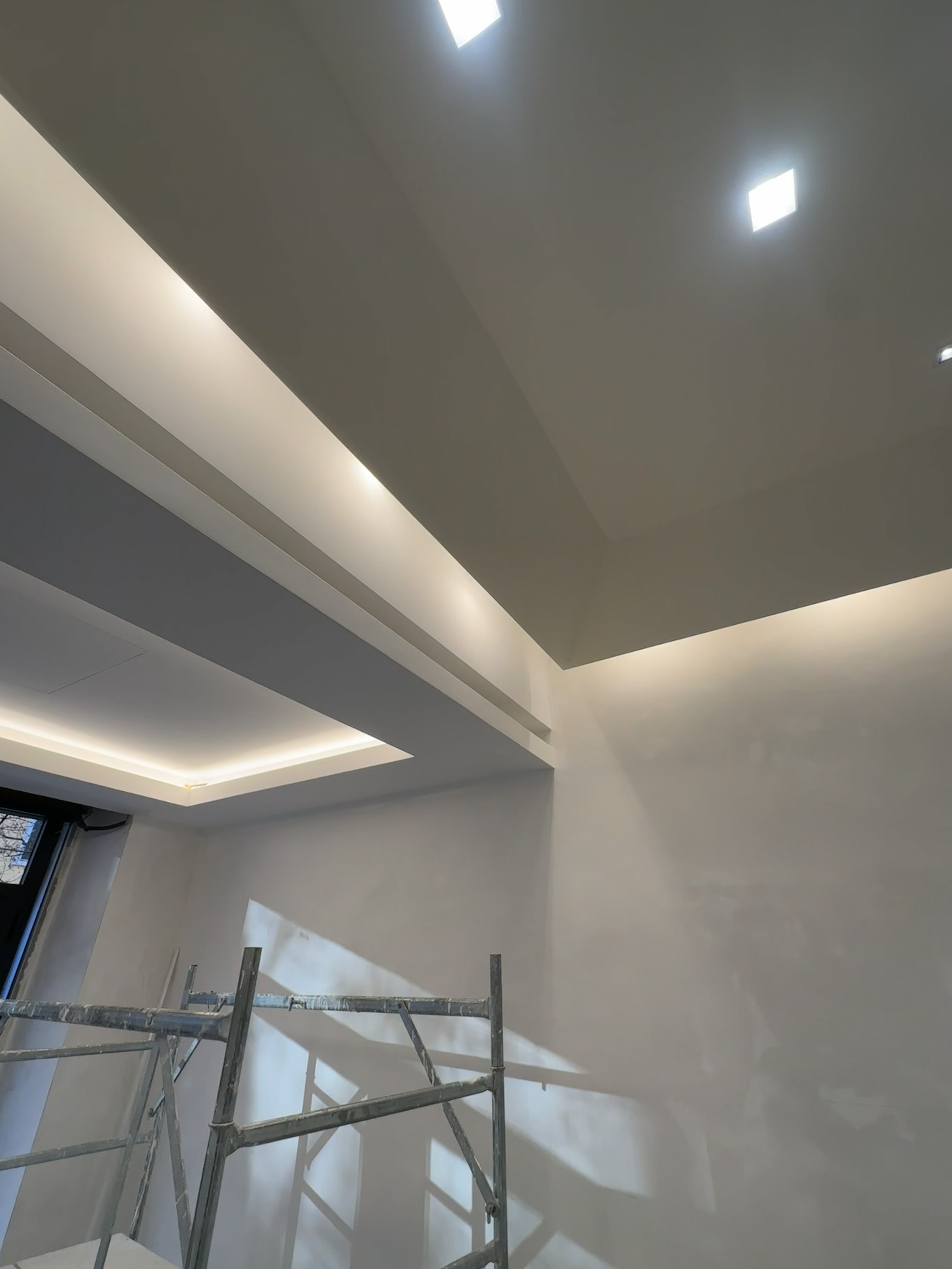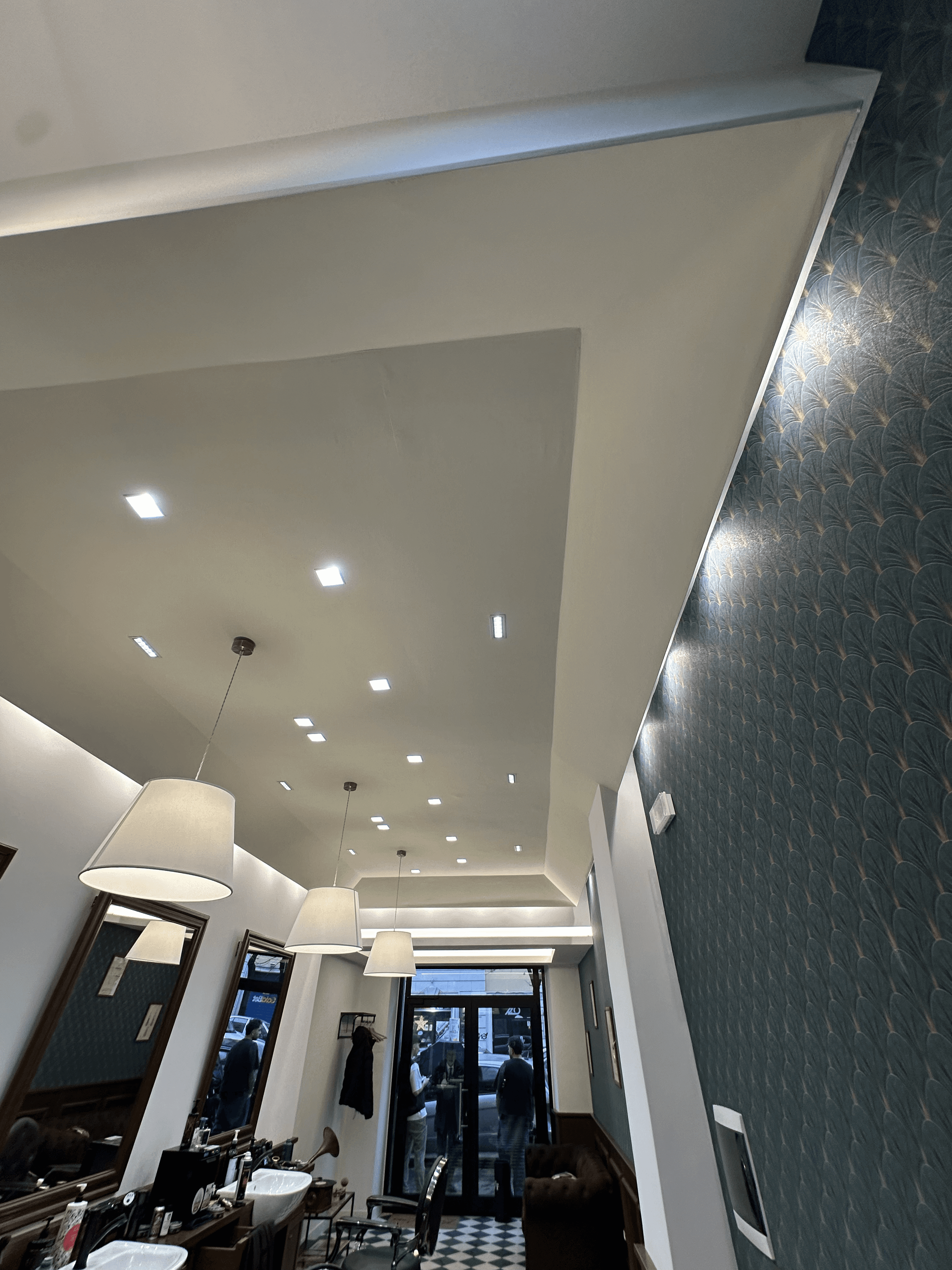 È stata progettata una profonda veletta ancorata al soffitto esistente, che incornicia le postazioni di lavoro, riducendo al minimo i costi e l'intervento. All’ingresso, invece, l’atmosfera diventa più domestica: soffitto ribassato e luce diffusa nelle gole, così da ottenere una sala d’attesa riservata. L’insieme amplifica la percezione dello spazio e introduce un’esperienza più intensa e curata.